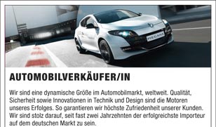 Wir sind eine dynamische Größe im Automobilmarkt, weltweit. Qualität, Sicherheit sowie Innovationen in Technik und Design sind die Motoren unseres Erfolges. So garantieren wir höchste Zufriedenheit unserer Kunden. Wir sind stolz darauf, seit 15 Jahren der erfolgreichste Importeur im deutschen Markt zu sein. Zur Verstärkung unseres Teams suchen wir eine/n Verkäufer/in Neuwagen.